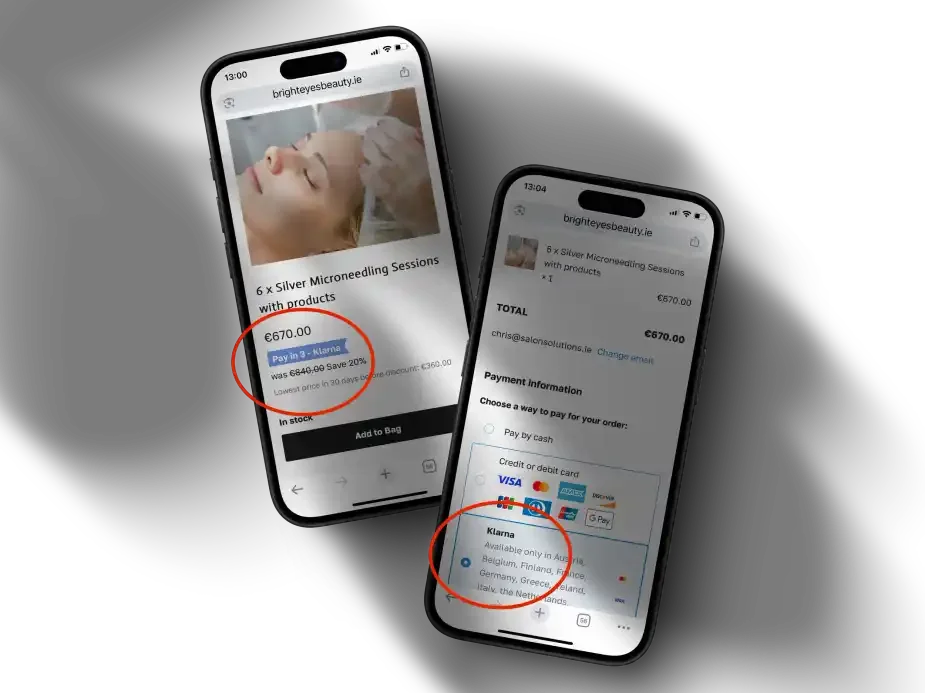 Our shops have klarna installed as standard. This service allows clients to spread the cost of expensive products and treatments over 3 payments. This means that your clinic’s services are more accessible to a wider group of clients who ordinarily would not be able to afford them, leading to an increase in revenue for your clinic.